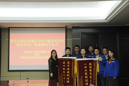 為表達(dá)對(duì)特發(fā)信息優(yōu)質(zhì)產(chǎn)品和高效服務(wù)的感謝之情,承建商特變電工將兩面寫著“匠心極致出精品,篤守進(jìn)度創(chuàng)佳績(jī)”和“一絲不茍創(chuàng)佳績(jī),熱情服務(wù)保工期”的錦旗授予特發(fā)信息和公司工程人員。