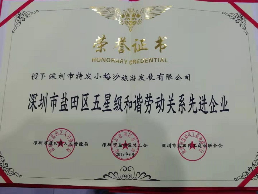 小梅沙旅游榮獲鹽田區(qū)五星級(jí)和諧勞動(dòng)關(guān)系企業(yè)稱號(hào)